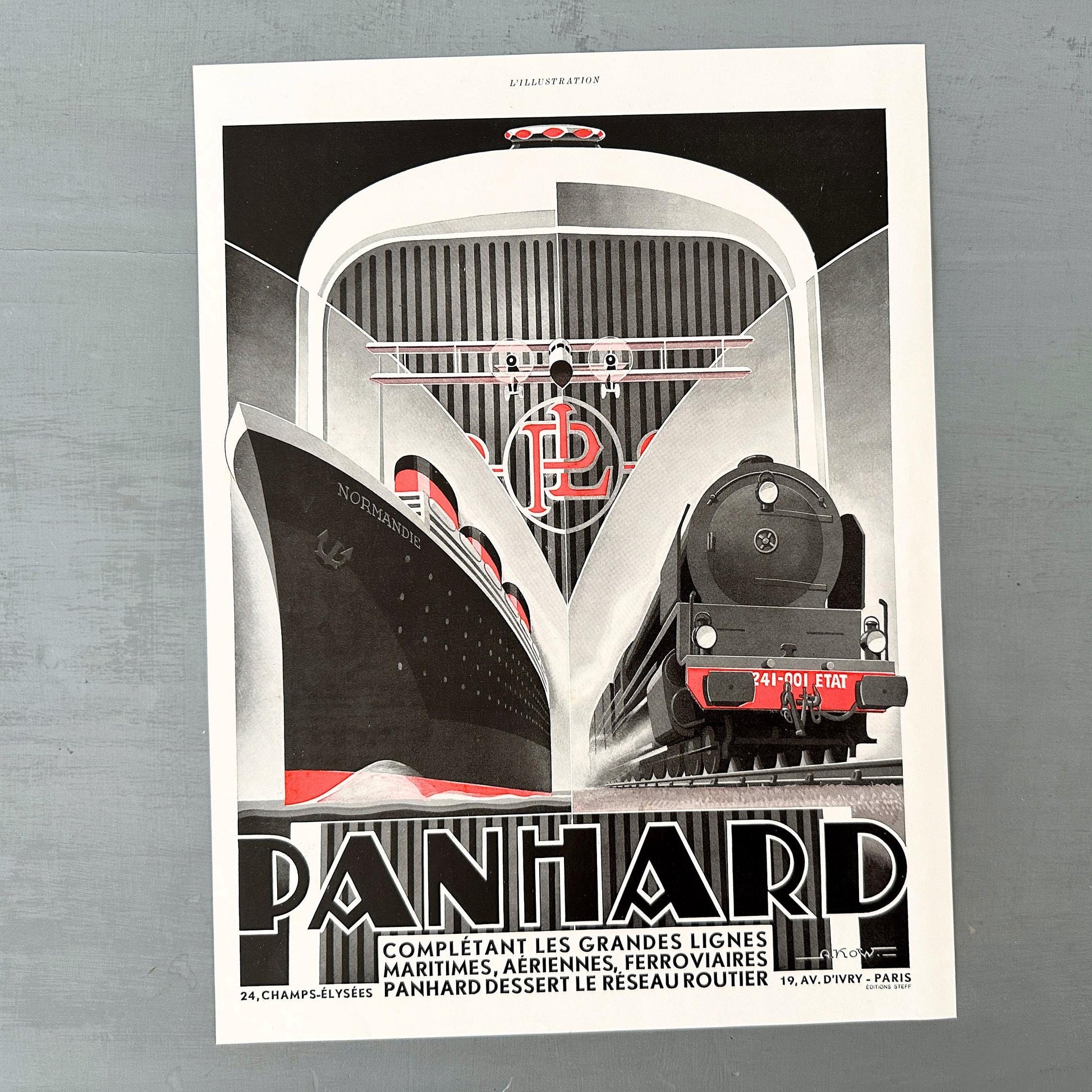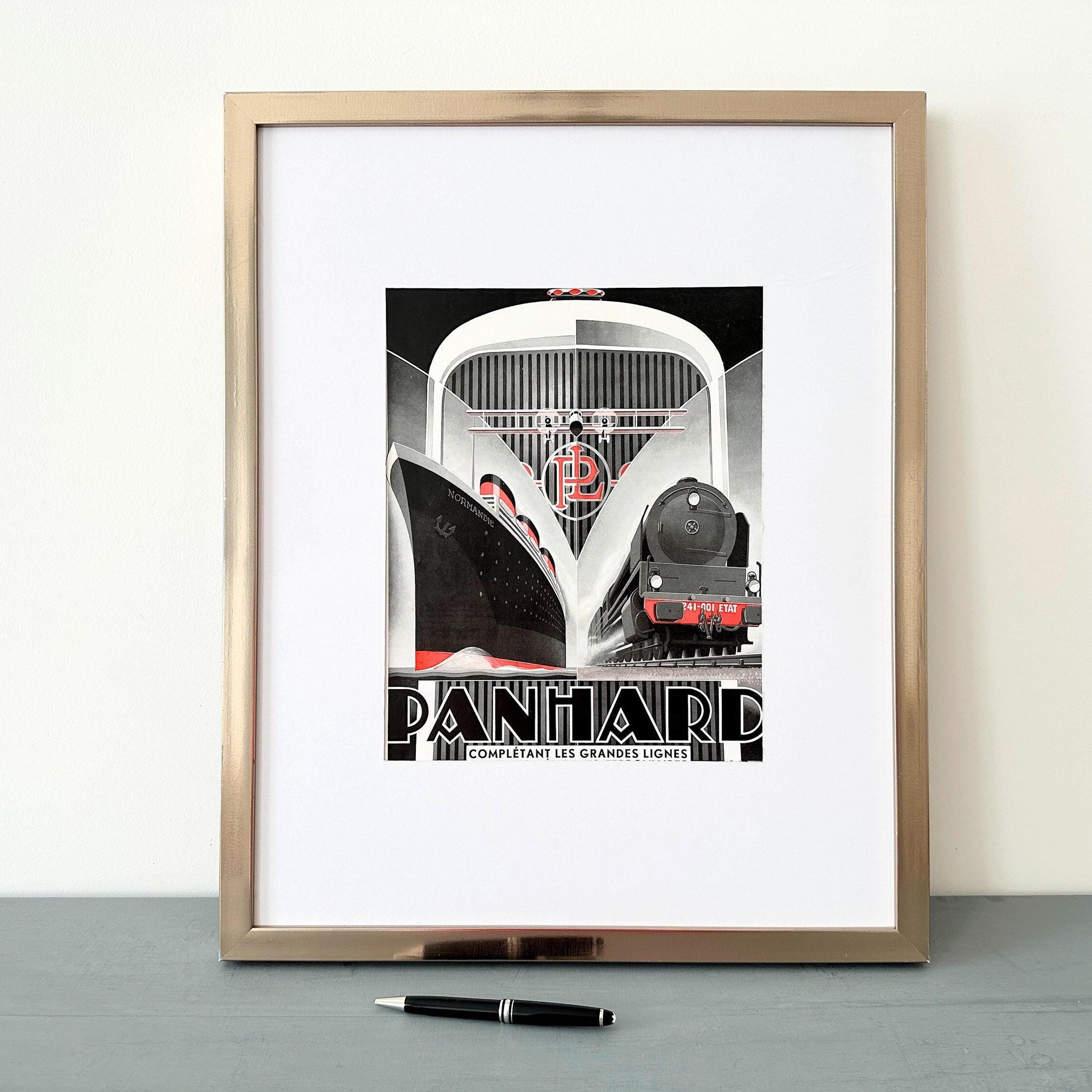 1930s Vintage Panhard Car, Transatlantic Liner, Train, Airplane Ad Print by Alexis Kow