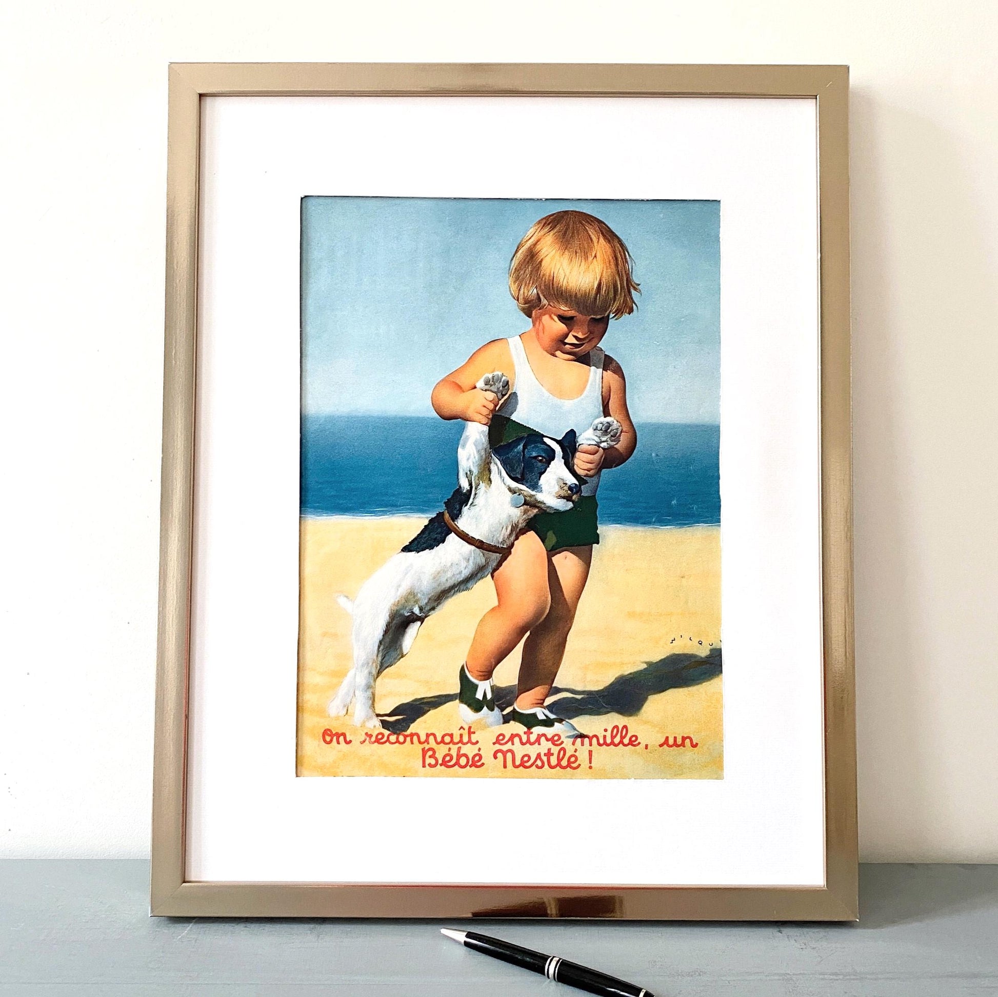 Vintage Boy Poster, Retro Food Ad Print, French Home Decor, Rustic Nursery Art, 1930s French Poster, Baby on the Beach, Kids Bathroom Decor, French Wall Art, Nestle Advertisement, Baby Room Wall Art, Retro Wall Hanging, Funny Kid with Dog, Drawing A Wilquin, France4you