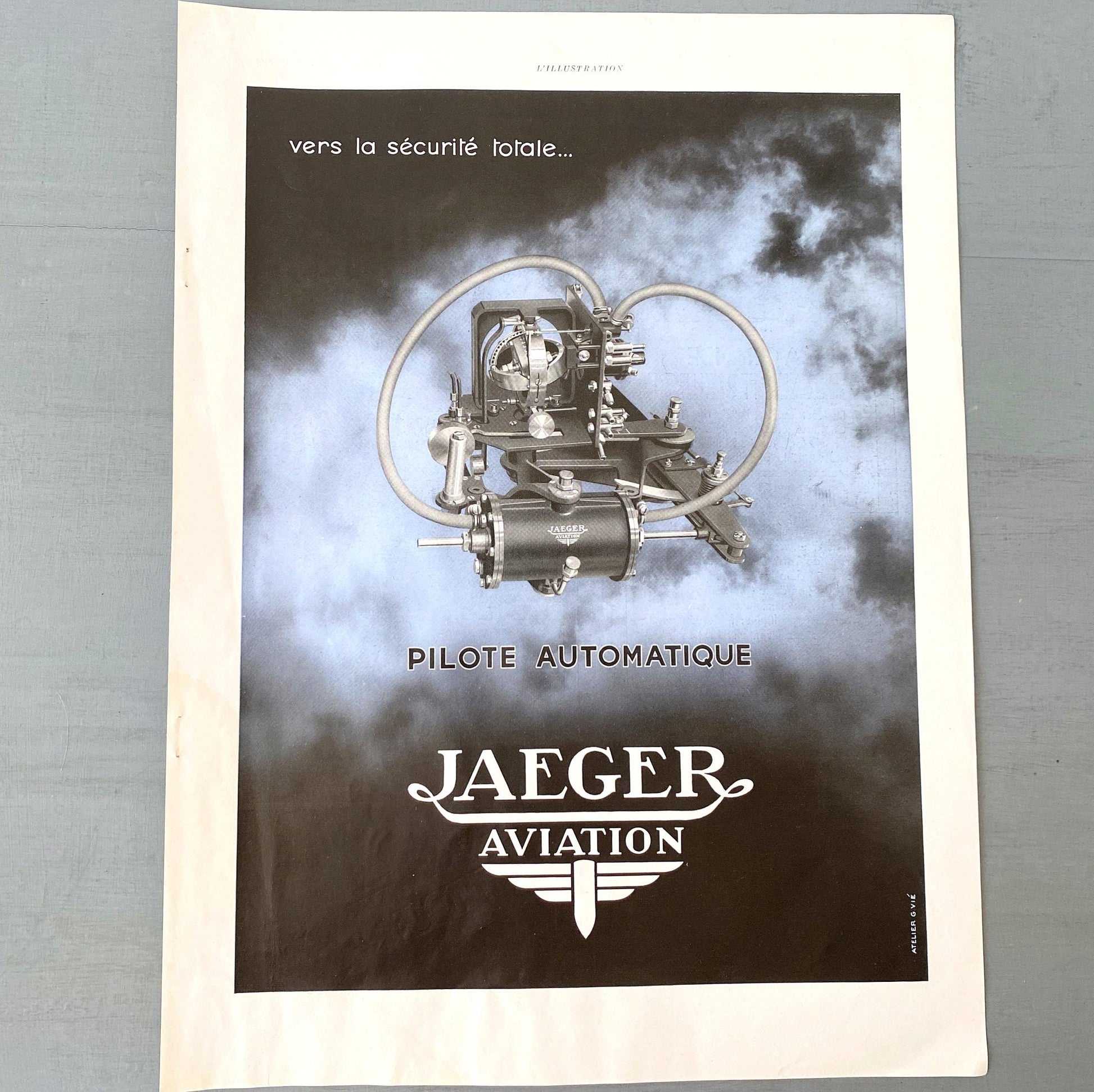 A full page of Jaeger aviation rare vintage advertisement print, published during period of 1843-1955 years. This advertisement is highly collectible and becoming more rare and difficult to find. This original poster was taken carefully from the authentic vintage French illustrated magazine. This ad is not a reproduction or modern re-print, the publisher name and date are printed at the top of the ad.