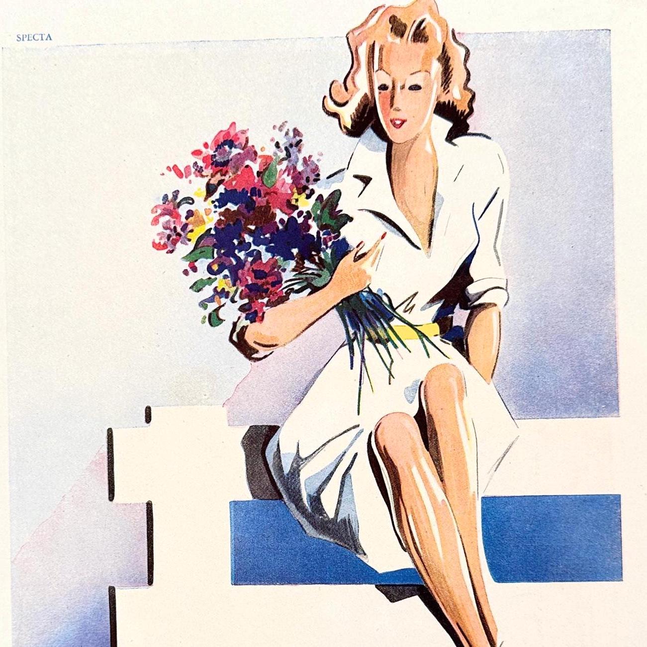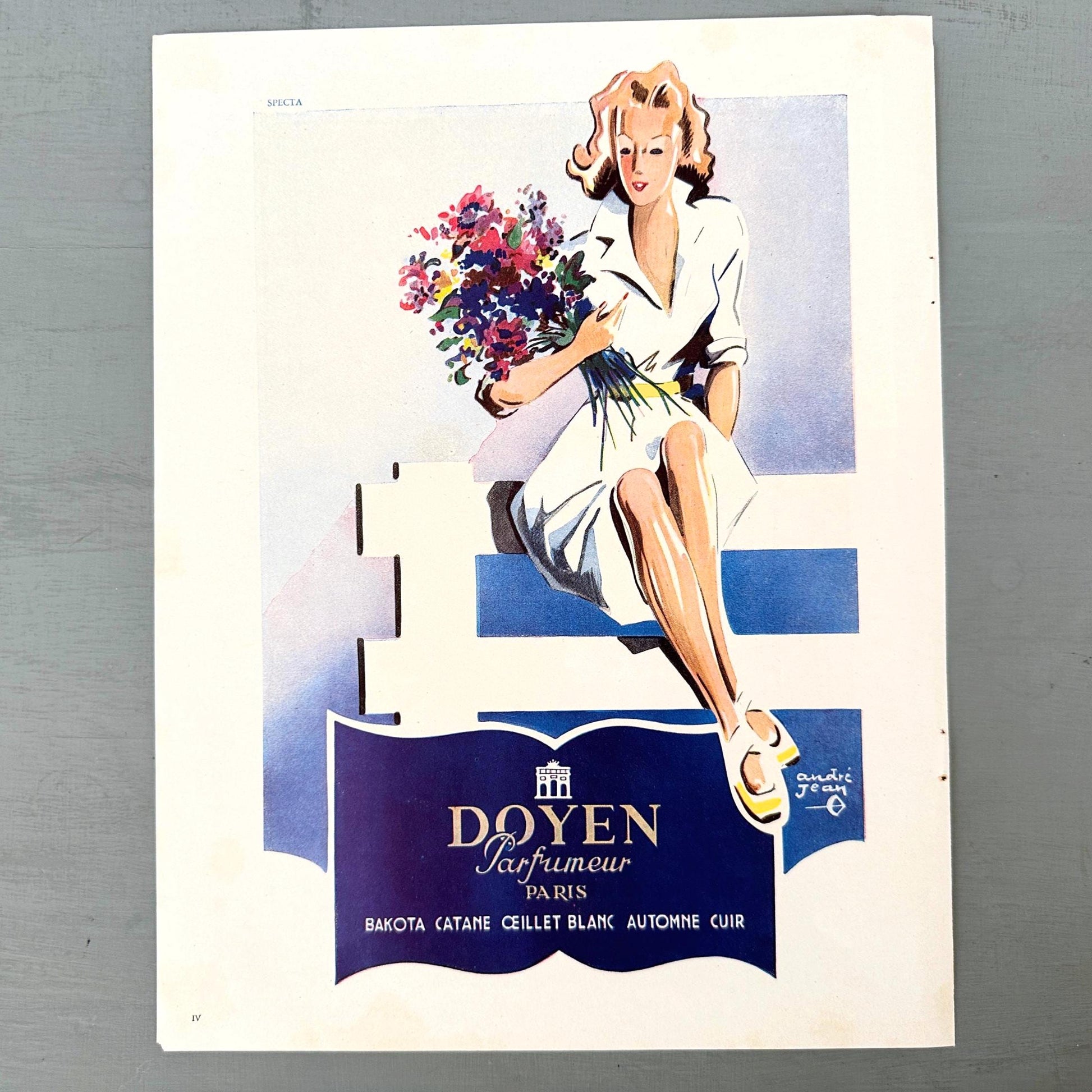 A full page of French perfume rare vintage advertisement, published during period of 1843-1955 years. Illustrator Andre Jean. This advertisement is highly collectible and becoming more rare and difficult to find. This original poster was taken carefully from the authentic vintage French illustrated magazine. This ad is not a reproduction or modern re-print, the publisher name and date are printed at the top of the ad. Signed by Illustrator Andre Jean.