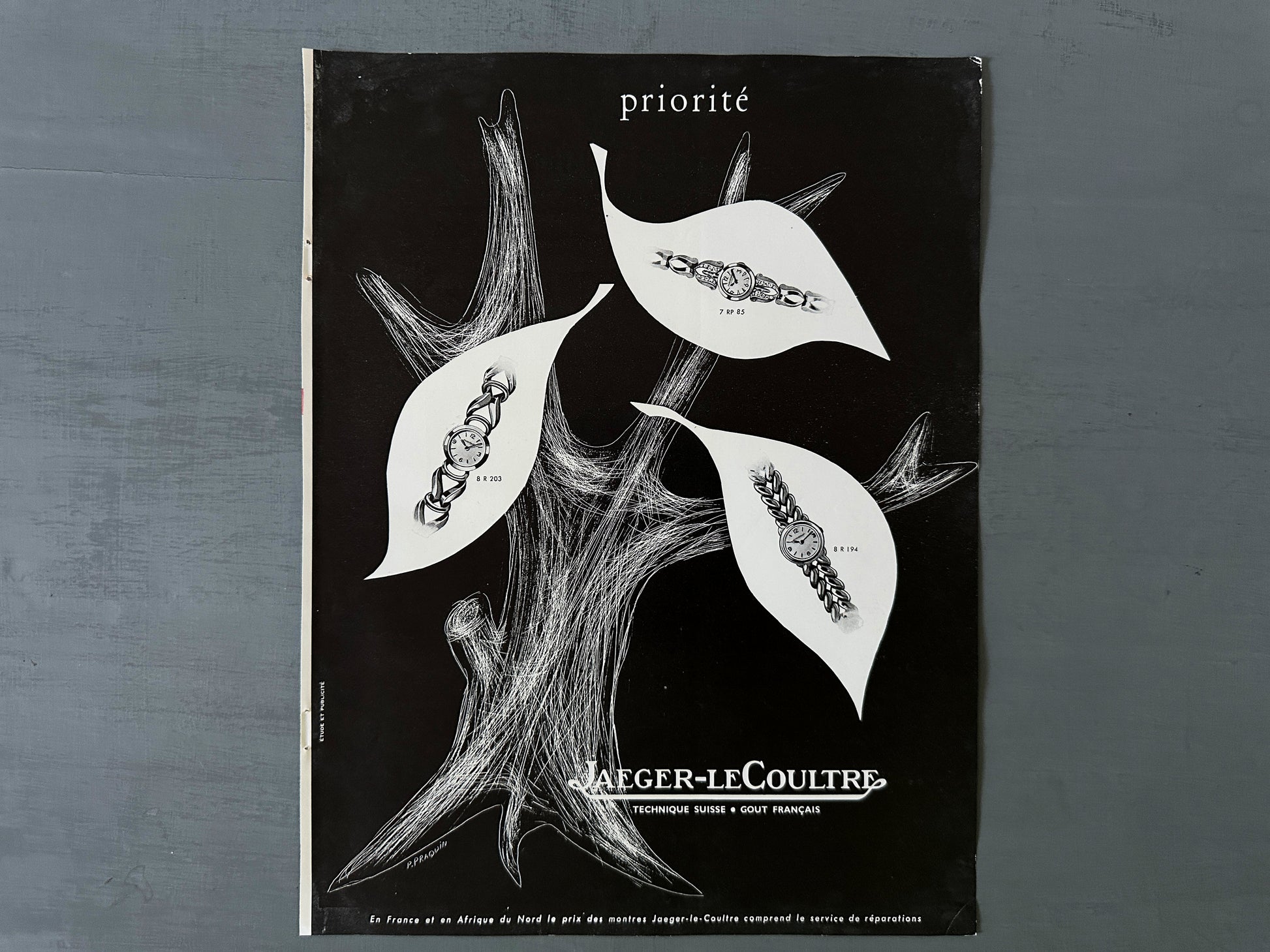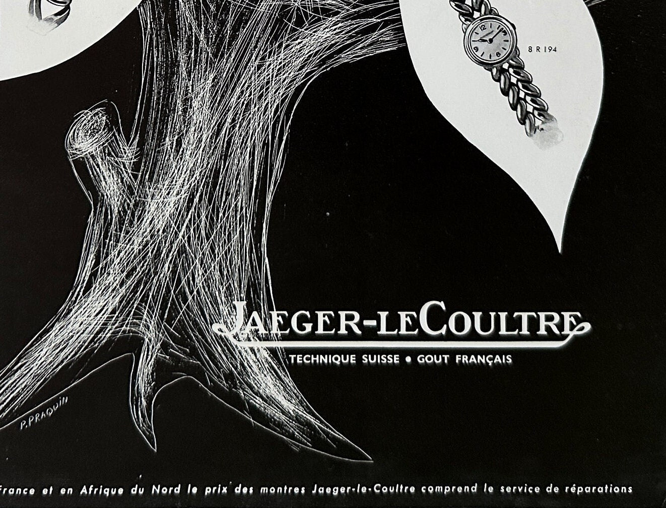 A full page of rare vintage Jaeger leCoultre advertisement print, published during period of 1843-1955 years. Signed by Illustrator P. Praquin. This advertisement is highly collectible and becoming more rare and difficult to find. This original poster was taken carefully from the authentic vintage French illustrated magazine. This ad is not a reproduction or modern re-print, the publisher name and date are printed at the top of the ad.
