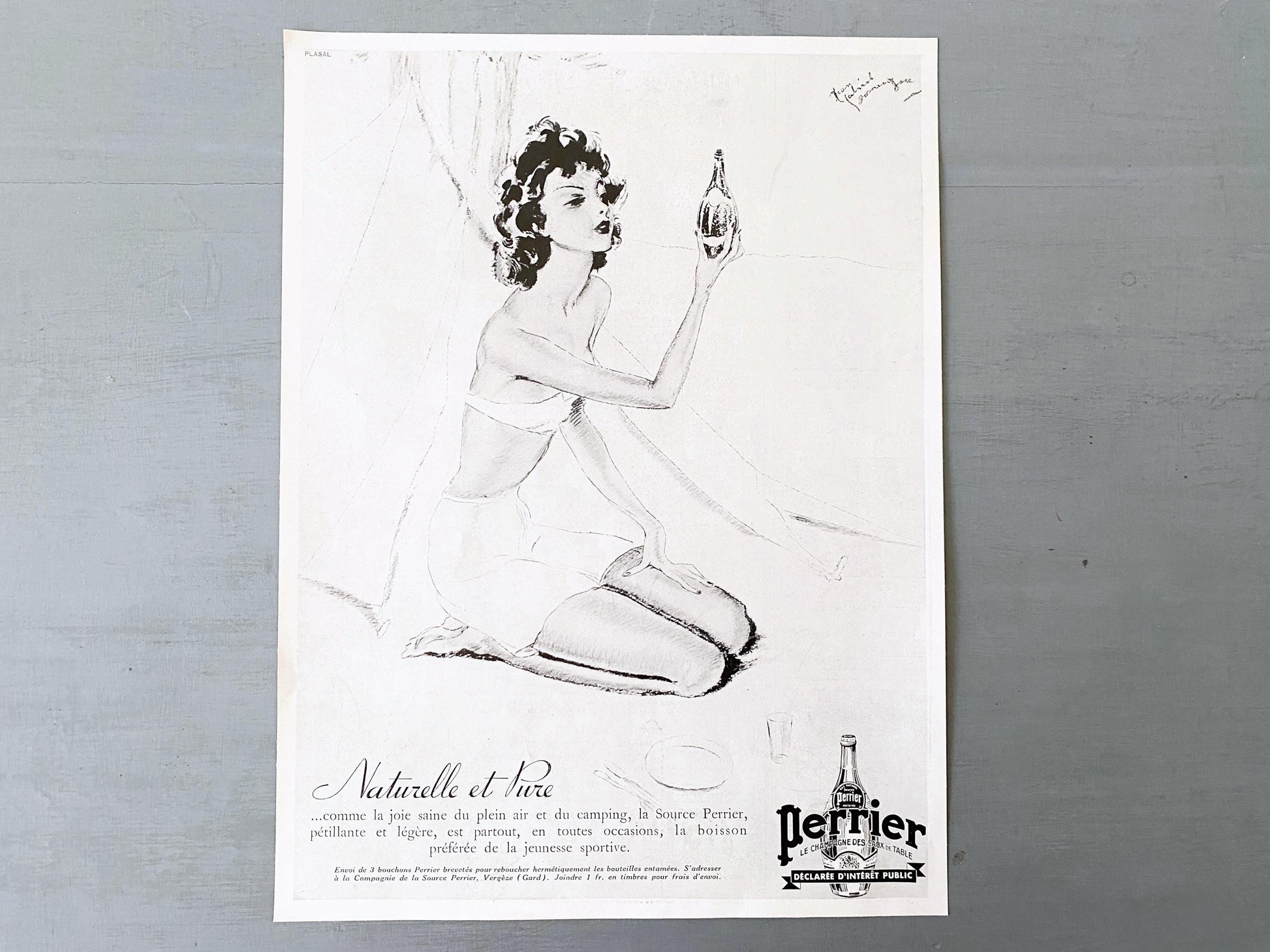 A full page of Perrier mineral water rare vintage advertisement print, published during period of 1843-1955 years. Signed by Illustrator Jean-Gabriel Domergue. This advertisement is highly collectible and becoming more rare and difficult to find. This original poster was taken carefully from the authentic vintage French illustrated magazine. This ad is not a reproduction or modern re-print, the publisher name and date are printed at the top of the ad.