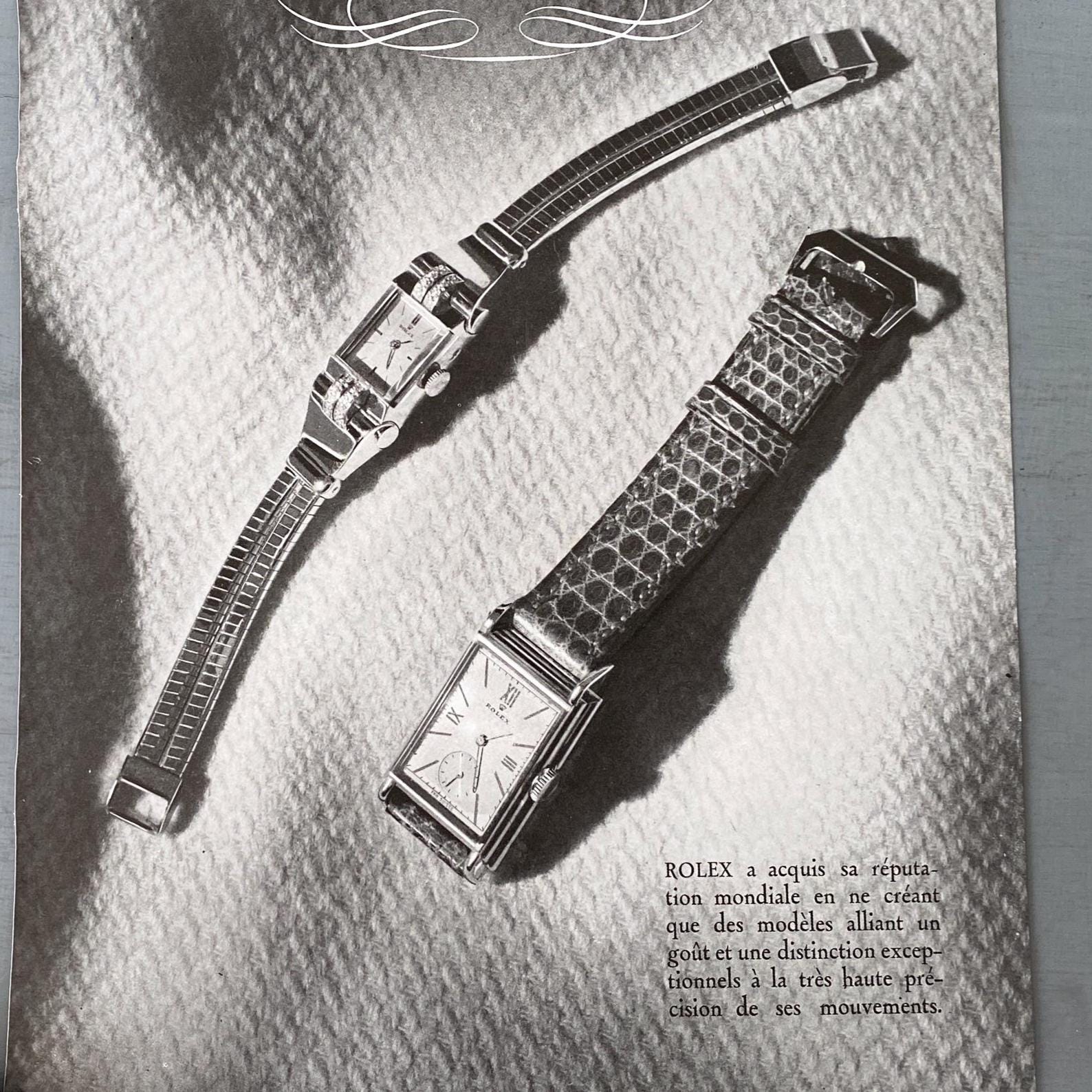 A full page of rare vintage Rolex watch advertisement print published during period of 1843-1955 years. This is extract from a vintage magazine. This advertisement is highly collectible and becoming more rare and difficult to find. This original poster was taken carefully from the authentic vintage French illustrated magazine. This ad is not a reproduction or modern re-print, the publisher name and date are printed at the top of the ad.