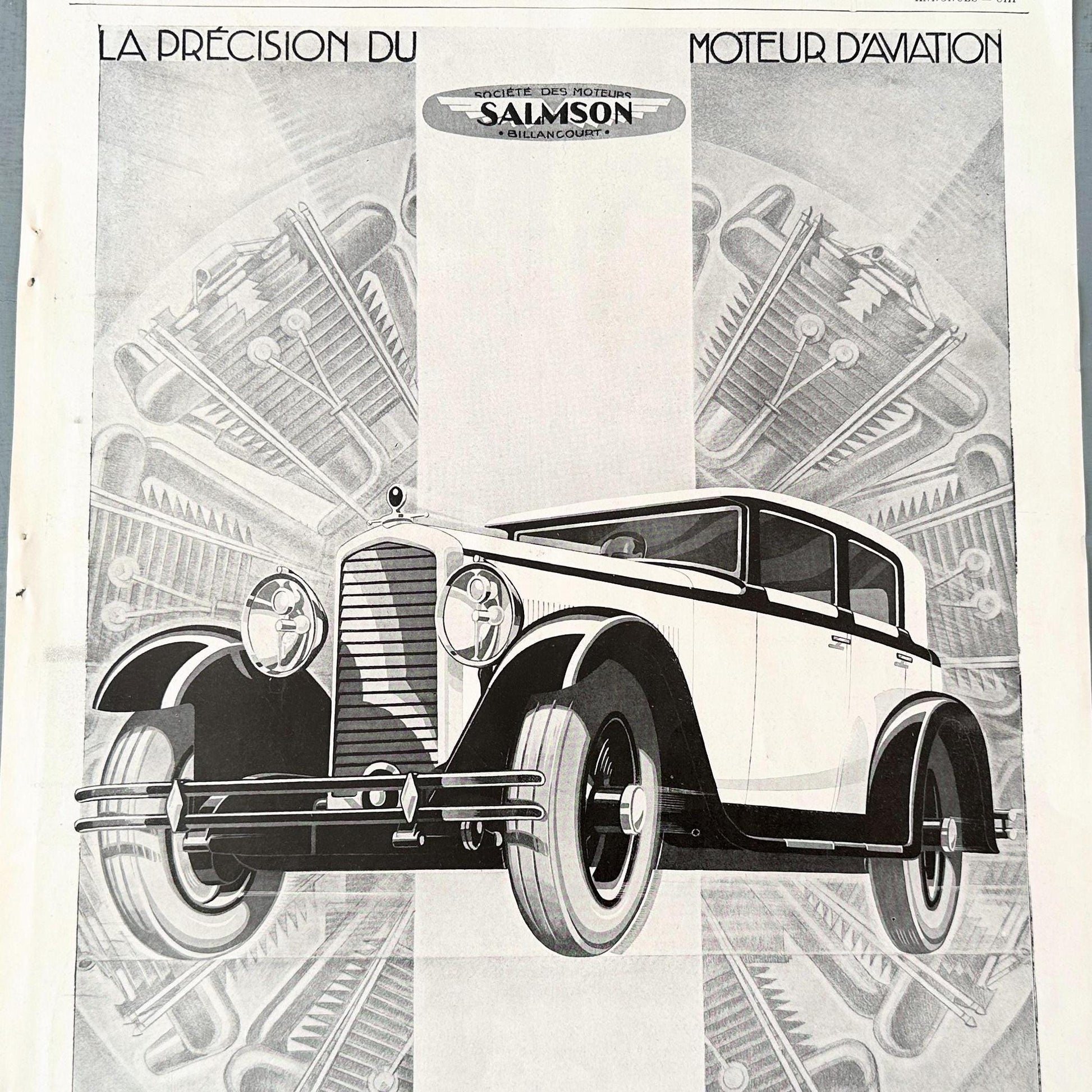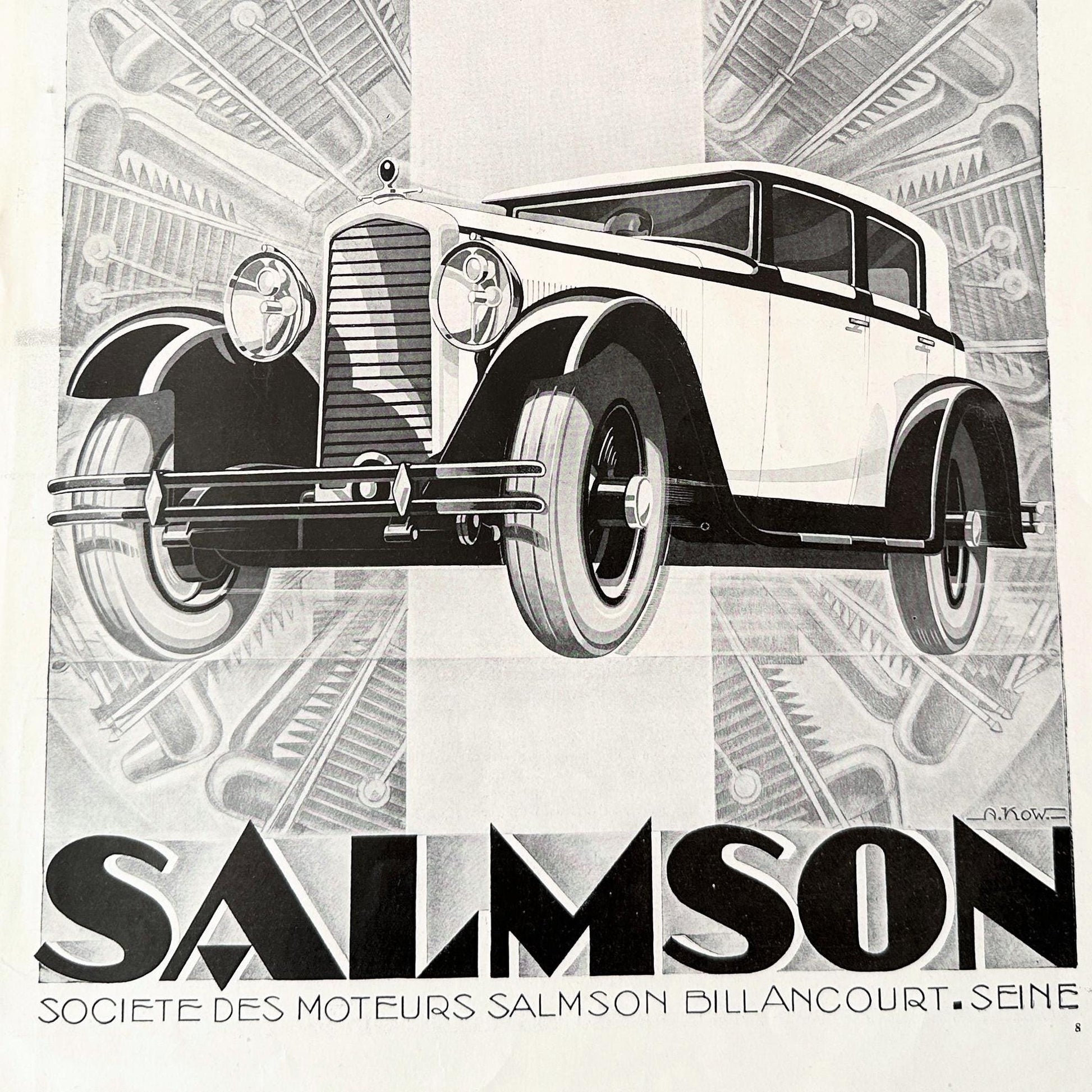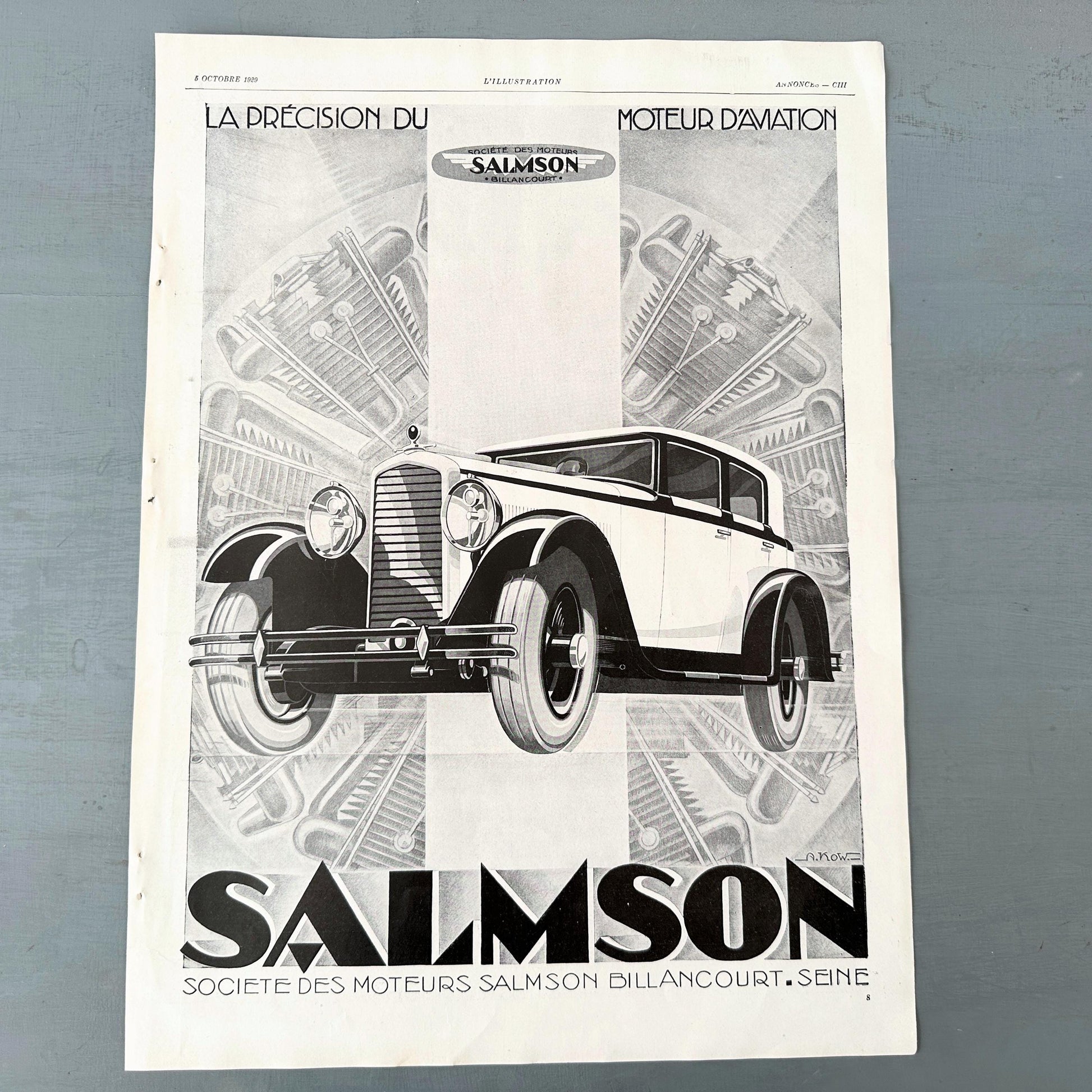 A full page of rare vintage classic Salmson car advertisement, published during period of 1843-1955 years. Signed by Illustrator Alexis Kow. This advertisement is highly collectible and becoming more rare and difficult to find. This original poster was taken carefully from the authentic vintage French illustrated magazine. This ad is not a reproduction or modern re-print, the publisher name and date are printed at the top of the ad.