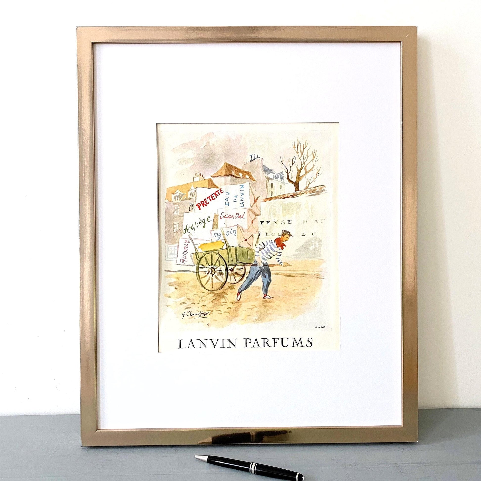 A full page of Lanvin perfume rare vintage advertisement print extracted from a vintage magazine, published during period of 1843-1970 years. Signed by illustrator Illustrator Guillaume Gillet. This advertisement is highly collectible and becoming more rare and difficult to find. This original poster was taken carefully from the authentic vintage French illustrated magazine. This ad is not a reproduction or modern re-print, the publisher name and date are printed at the top of the ad.