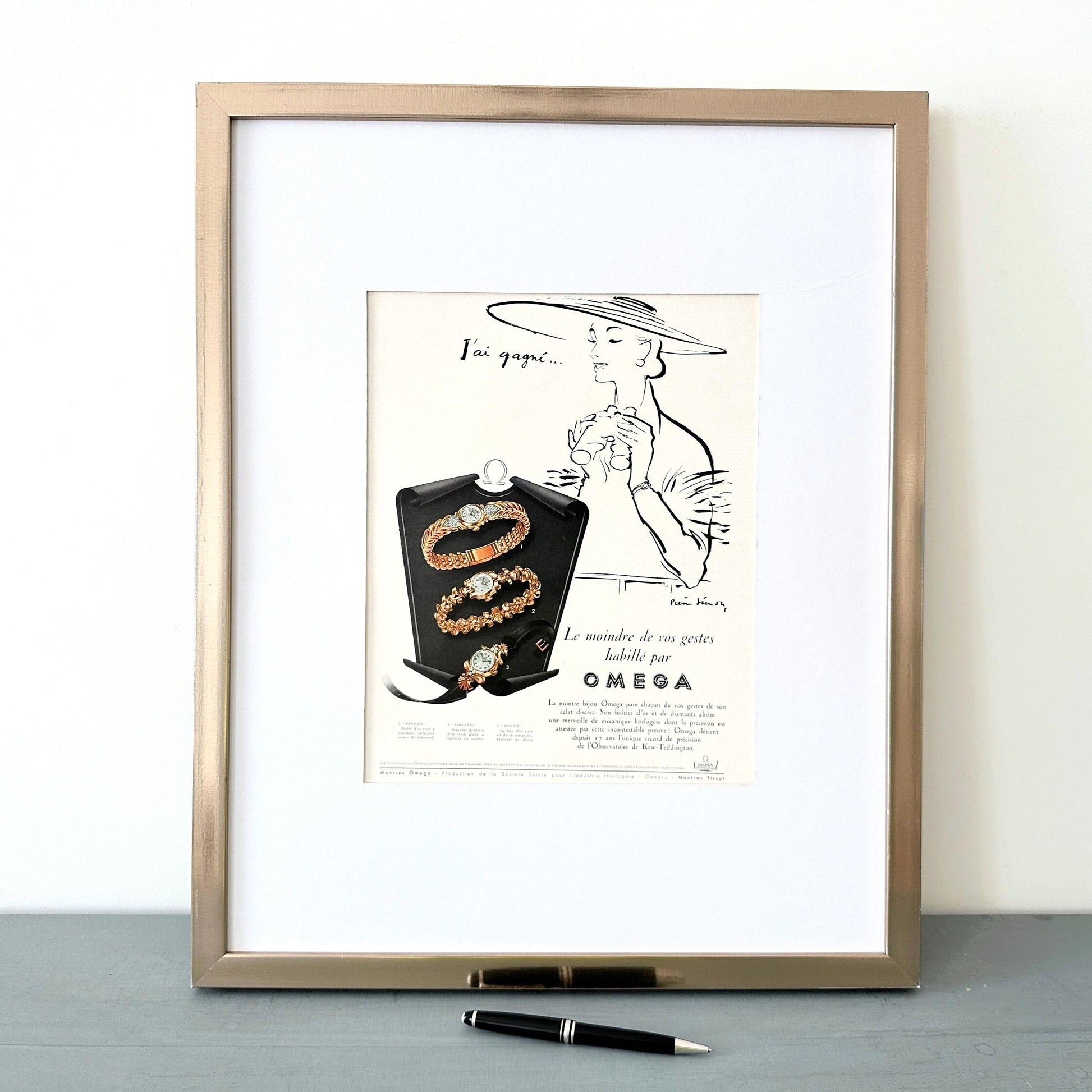 A full page of Swiss Omega watch rare vintage advertisement, published during period of 1843-1955 years. Signed by Illustrator Pierre Simon. This advertisement is highly collectible and becoming more rare and difficult to find. This original poster was taken carefully from the authentic vintage French illustrated magazine. This ad is not a reproduction or modern re-print, the publisher name and date are printed at the top of the ad.
