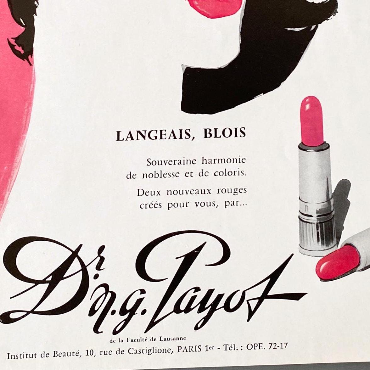 A full page of French rare vintage lithograph Payot make up advertisement, published during period of 1843-1955 years. Signed by Rene Gruau. This advertisement is highly collectible and becoming more rare and difficult to find. This original poster was taken carefully from the authentic vintage French illustrated magazine. This ad is not a reproduction or modern re-print, the publisher name and date are printed at the top of the ad.