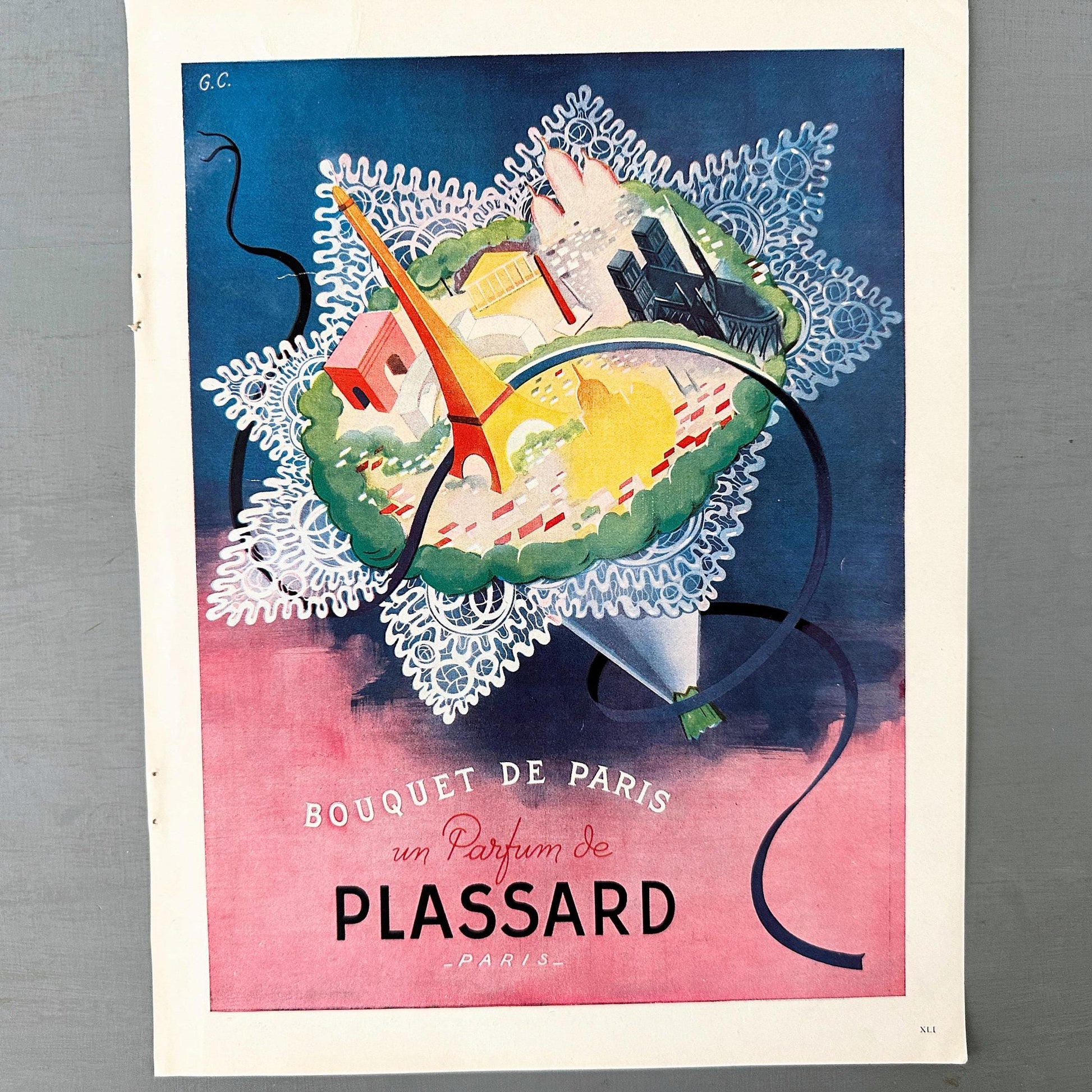 A full page of French rare vintage perfume advertisement, published during period of 1843-1955 years. This advertisement is highly collectible and becoming more rare and difficult to find. This original poster was taken carefully from the authentic vintage French illustrated magazine. This ad is not a reproduction or modern re-print, the publisher name and date are printed at the top of the ad.