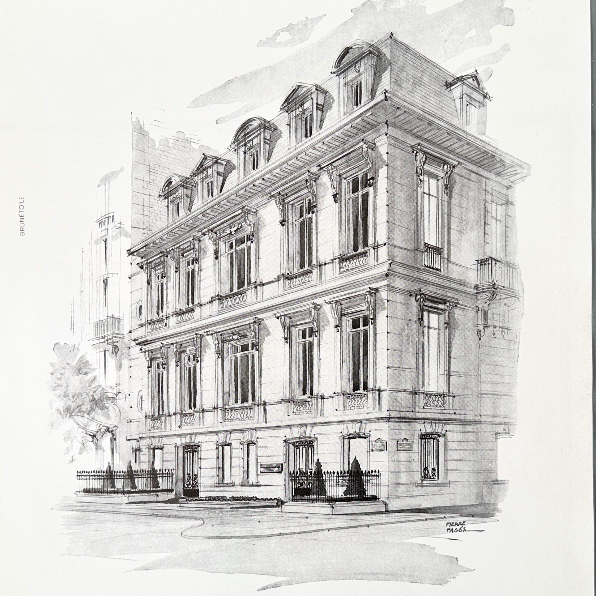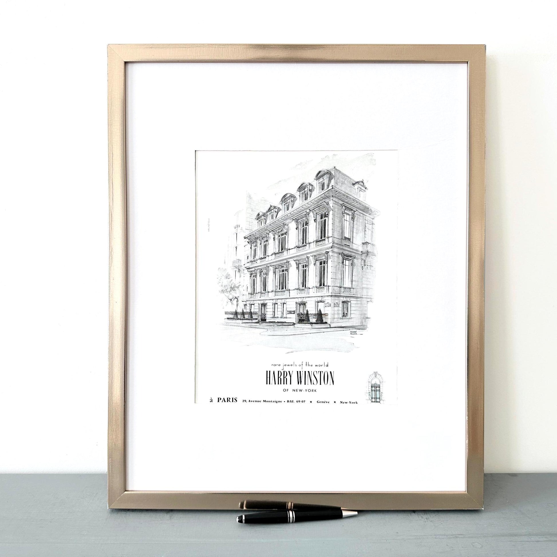 A full page of rare vintage Harry Winston shop advertisement, published during period of 1843-1955 years. Signed by illustrator Pierre Pages. This advertisement is highly collectible and becoming more rare and difficult to find. This original poster was taken carefully from the authentic vintage French illustrated magazine. This ad is not a reproduction or modern re-print, the publisher name and date are printed at the top of the ad.