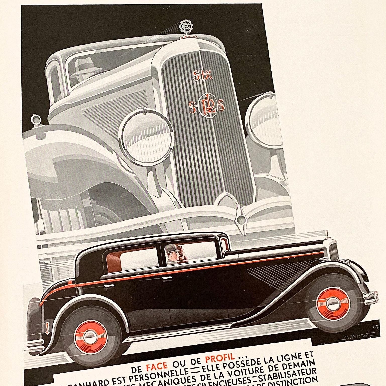A full page of antique Panhard car rare vintage lithograph advertisement, published during period of 1843-1955 years. Signed by illustrator Alexis Kow. This advertisement is highly collectible and becoming more rare and difficult to find. This original poster was taken carefully from the authentic vintage French illustrated magazine. This ad is not a reproduction or modern re-print, the publisher name and date are printed at the top of the ad.