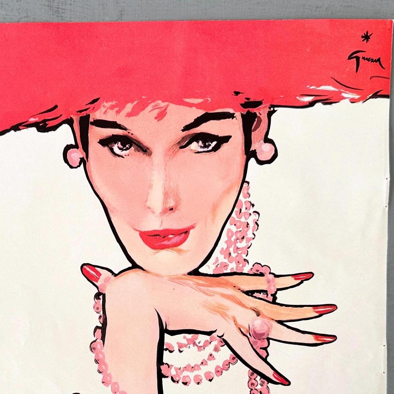 A full page of French rare vintage red lipstick advertisement by Rene Gruau, published during period of 1843-1955 years. This advertisement is highly collectible and becoming more rare and difficult to find. This original poster was taken carefully from the authentic vintage French illustrated magazine. This ad is not a reproduction or modern re-print, the publisher name and date are printed at the top of the ad.